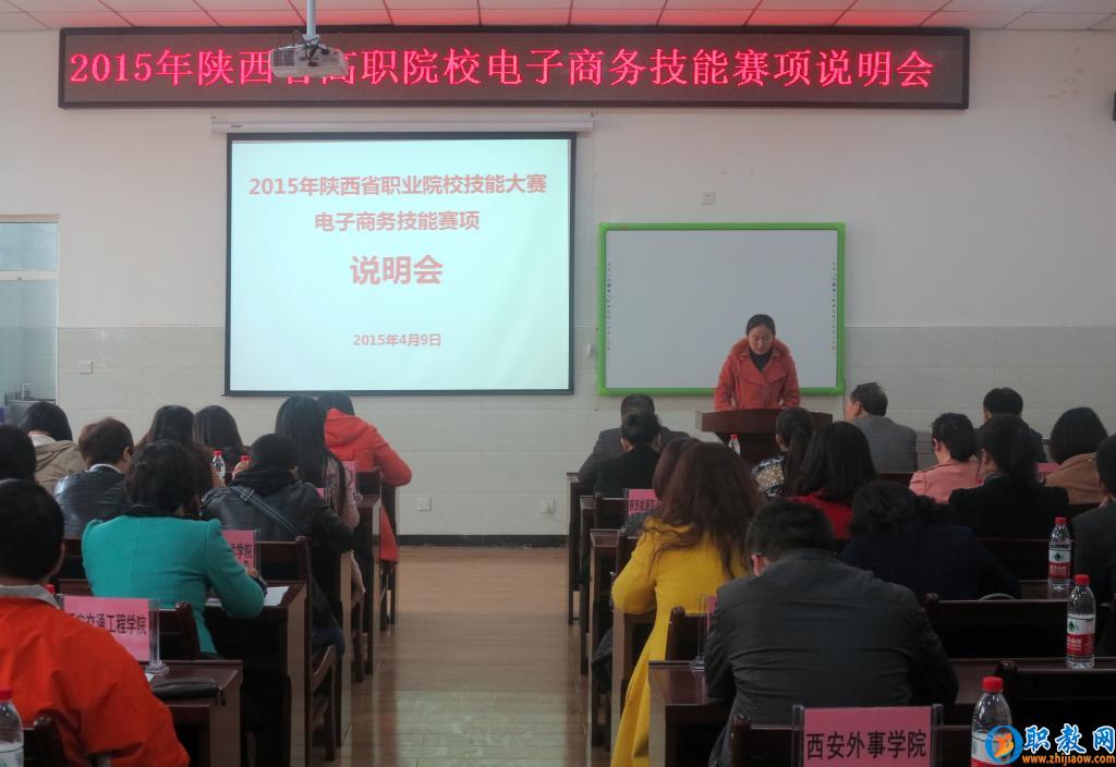 4月9日,2015年陕西省高职院校电子商务技能竞赛赛项说明会在陕西工院汽车工程与服务技术训练中心召开。中教畅享(北京)科技有限公司总经理黄学全、教务处副处长刘清、汽车与物流学院副院长王永莲和来自省内22所职业院校的领导及教师代表50余人参加会议,会议由汽车与物流学院实训中心主任陈昊平主持。