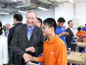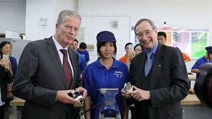 米特雷纳副总理对学生们的钳工技术连连称赞,还兴致勃勃地接过学生手中的锉刀亲自体会了一番。当带教指导老师将学生制作的工件作为纪念品送给米特雷纳副总理、莱特尔主席时,两位先生高兴地邀请学生们合影留念。