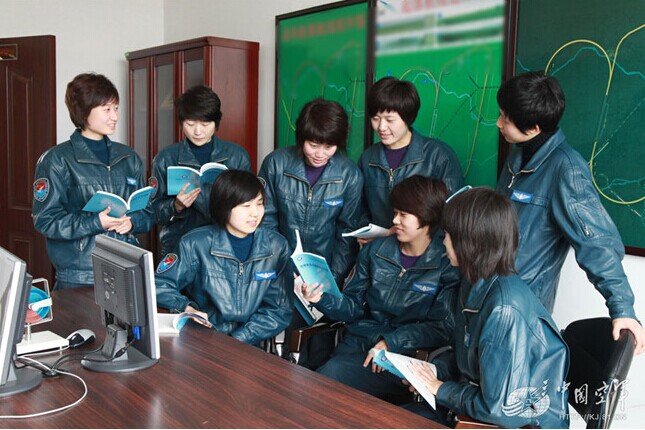 空军女歼击机飞行员针对军事职业大学学习课程进行学习讨论。