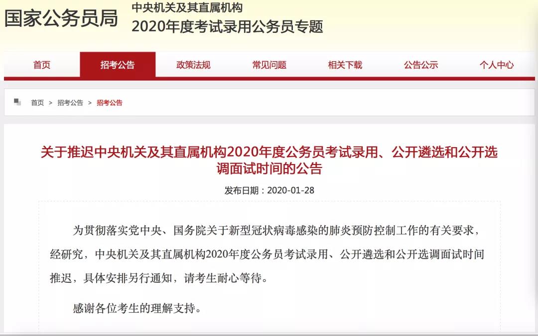 1月28日,国家公务员局发布公告称,为贯彻落实党中央、国务院关于新型冠状病毒感染的肺炎预防控制工作的有关要求,经研究,中央机关及其直属机构2020年度公务员考试录用、公开遴选和公开选调面试时间推迟,具体安排另行通知,请考生耐心等待。