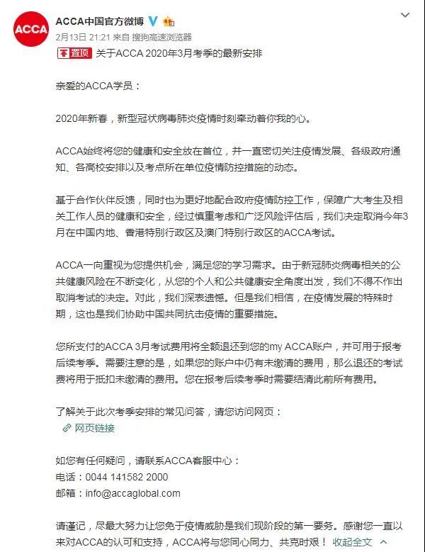 2月13日ACCA中国官方微博:“基于合作伙伴反馈,同时也为更好地配合政府疫情防控工作,保障广大考生及相关工作人员的健康和安全,经过慎重考虑和广泛风险评估后,我们决定取消今年3月在中国内地、香港特别行政区及澳门特别行政区的ACCA考试。”