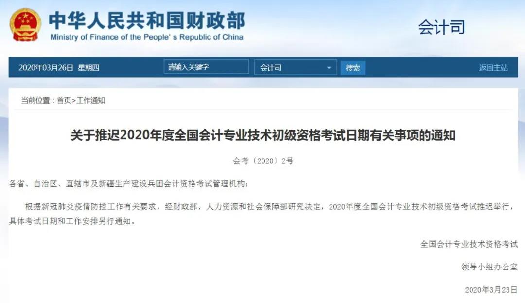 近日,财政部、人社部发布消息,2020年度全国会计专业技术初级资格考试推迟举行,具体考试日期和工作安排另行通知。