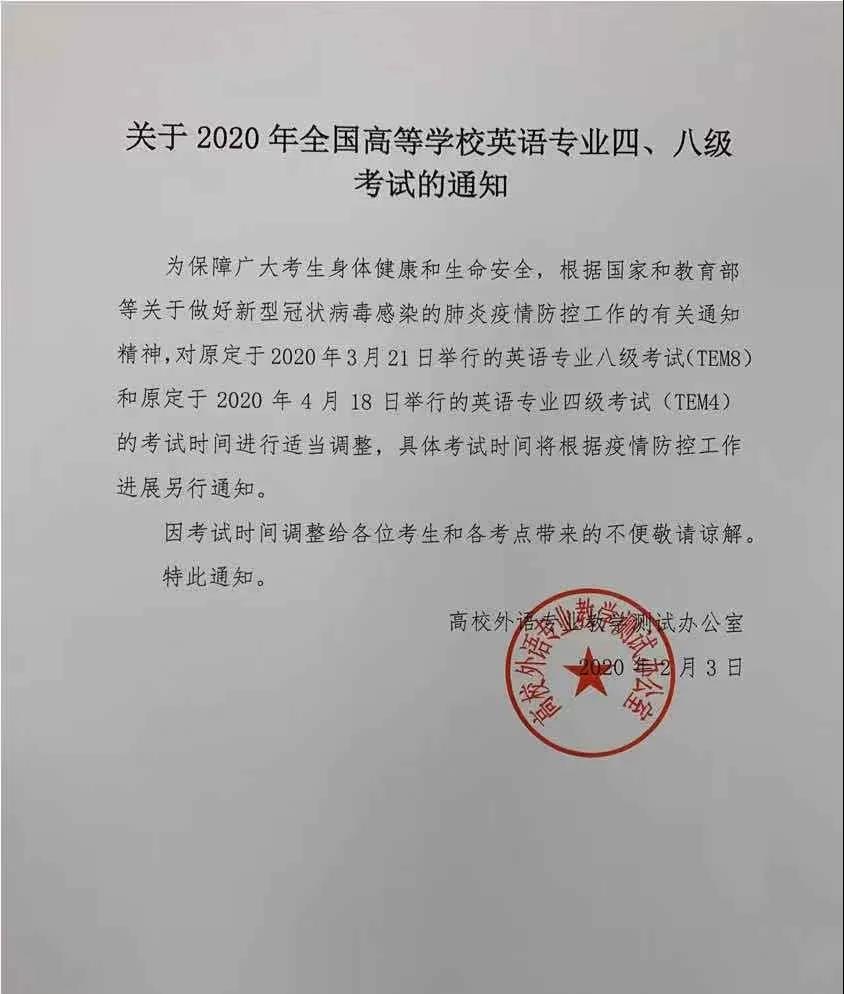 原定于3月21日举行的英语专业八级考试和原定于4月18日举行的英语专业四级考试的考试时间将进行适当调整,具体考试时间将根据疫情防控工作进展另行通知。