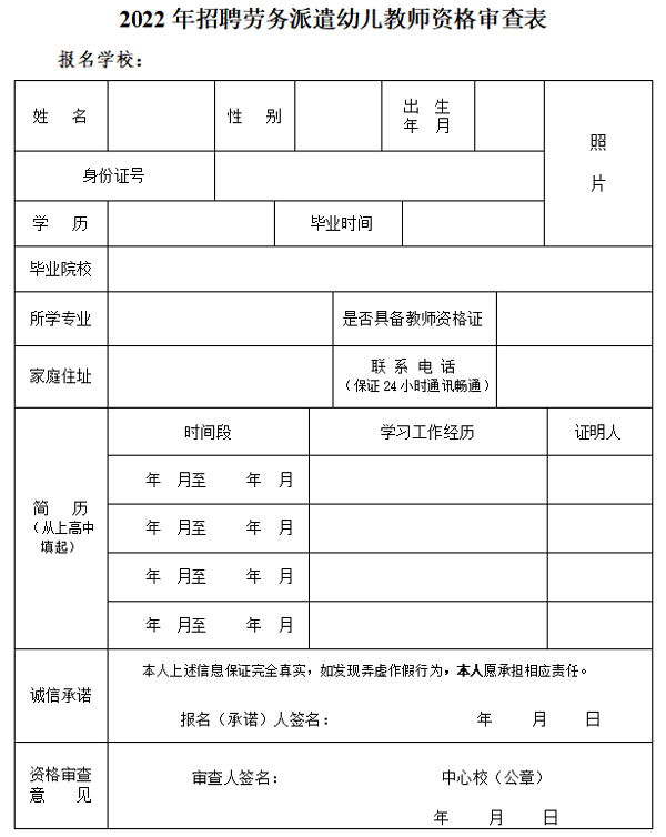 具有中华人民共和国国籍,遵守国家的法律、法规,无不良社会行为记录,具有良好的职业道德,热爱幼教事业,身心健康,要求年龄在18周岁以上、30周岁以下(1992年8月31日以后出生)、具有专科及以上学历、持有教师资格证。 被聘人员实行劳务派遣制,统一与区劳务派遣中心签订劳动合同,原则上两年一聘。由各幼儿园按照《唐山市丰南区人民政府关于印发〈唐山市丰南区机关事业单位劳务派遣人员管理办法〉的通知》(丰政办[2013]2号)、《丰南区教育局关于实行劳务派遣制幼儿教师的管理规定》(丰教人字[2012]12号)实行日常管理,被聘人员从2022年10月起上岗。 试用期三个月,第一年工资按每人1900元/月(含个人担负保险)执行,区财政负责缴纳“五险”。工作满一年经区教育局考核合格后,工资按我区同岗位劳务派遣人员规定执行。 (一)招聘办法。面向社会组织公开招聘,采取笔试方式进行,按照成绩高低择优聘用。 1、报名初审。考生报名时先进行面试,主要考察报名者普通话、仪表、举止等基本素质。采取按各幼儿园所空职位分别报名的方式进行,每人限报一个幼儿园岗位。 2、资格审查、复查。面试合格后填写《2022年招聘劳务派遣幼儿教师资格审查表》,提交相关资历材料。区教育局统一对报名人员情况进行复核,复核通过后进行笔试。 3、笔试。经资格复查合格的人员参加由区教育局统一组织的笔试。笔试内容为幼儿教育学、心理学、卫生学及幼教五大领域基本常识和活动设计,试卷总分为100分,考试时间90分钟。 4、确定拟聘用人员。按照申报幼儿园职位和招聘名额,以笔试成绩与招聘人数按1:1的比例确定拟聘用人选。笔试成绩不及格的(60分以下)不予录用;成绩并列的,依次按学历层次较高者、年龄较小者择优确定。 5、体检。组织对拟聘用人员进行体检,体检不合格的,取消聘用资格。若某幼儿园岗位出现人选缺额时,从全区所有未录用人员中按成绩由高到低依次递补。若招聘名额录取不足时,重新组织报名考试。 6、聘用结果公示。对体检合格人员进行为期3天的公示,经公示无异议予以聘用。 1、报名宣传:2022年9月20日通过丰南区政府网进行宣传。 2、报名时间:2022年9月22-23日,每天上午9:00-11:00,下午2:00-4:00。 报名时须由报名者携带本人身份证、毕业证、教师资格证,要求提供原件及一份复印件,小二寸近期免冠正面彩色照片3张(1张粘在报名表,另2张反面写上乡镇、姓名用来制作准考证)。 复核。各幼儿园派专人携带报名人员材料于9月26日上午9点到区教育局人事科复核。 领取准考证。9月27日下午16:00,由各幼儿园派人取回准考证并发给报名人员。 (1)笔试时间、地点:2022年9月28日下午13:00-14:30,考试地点详见准考证。 (2)成绩公示时间:笔试成绩审核无误后立即公示,公示地点:区教育局老院公示栏 (一)报名人员所提供的资料必须真实有效,必须认真履行诚信承诺,凡发现报名信息与实际情况不一致,或存在弄虚作假行为的,取消其报名、聘用资格。